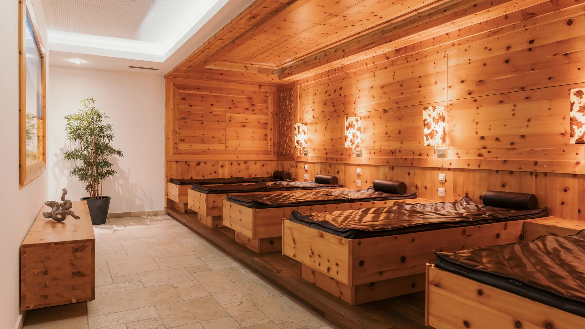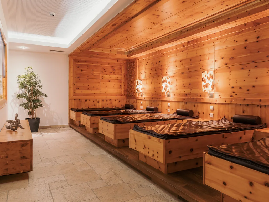 - Ruheräume: Zirbenruheraum mit Wasserbetten, Steinruheraum, Vitalbrunnen; Teebar